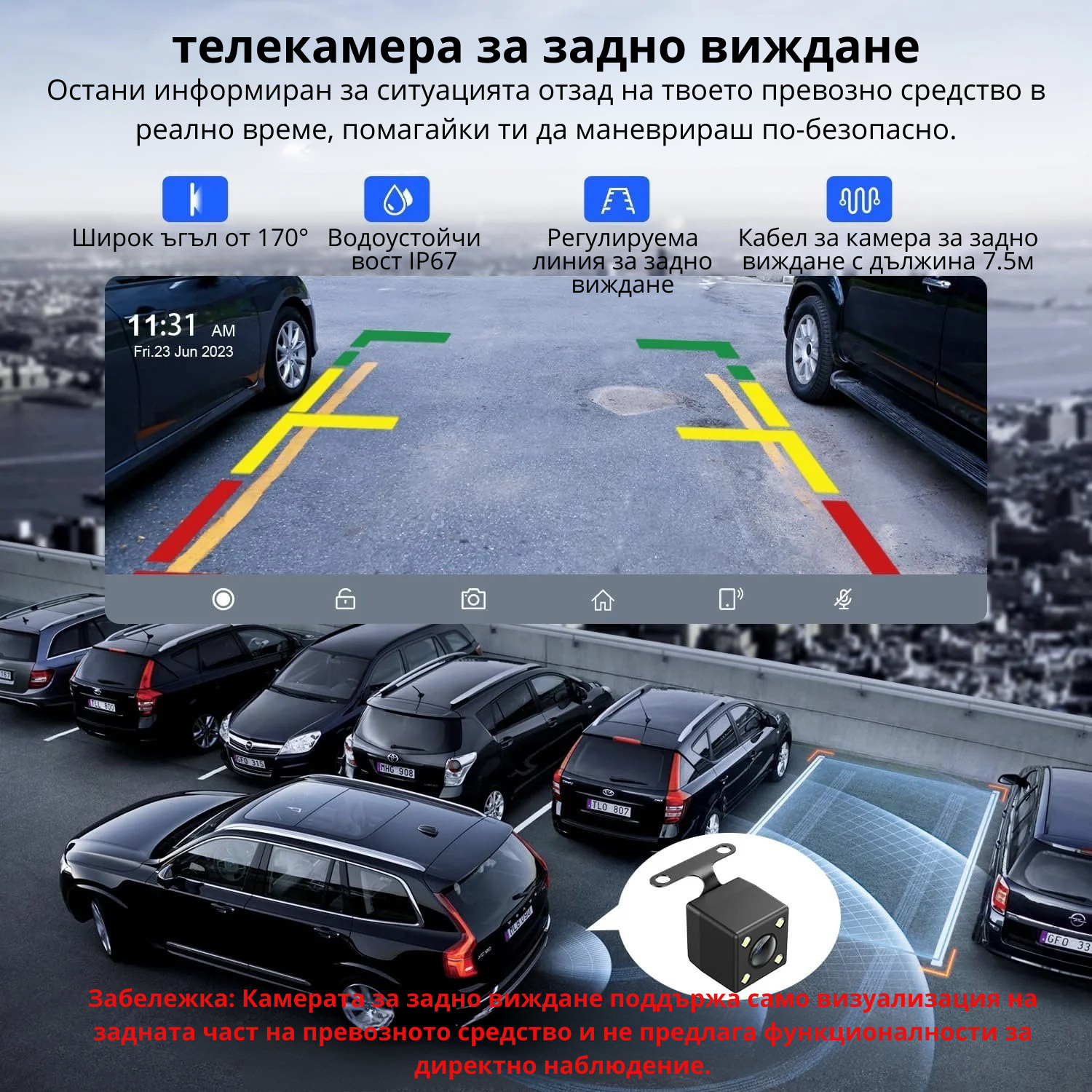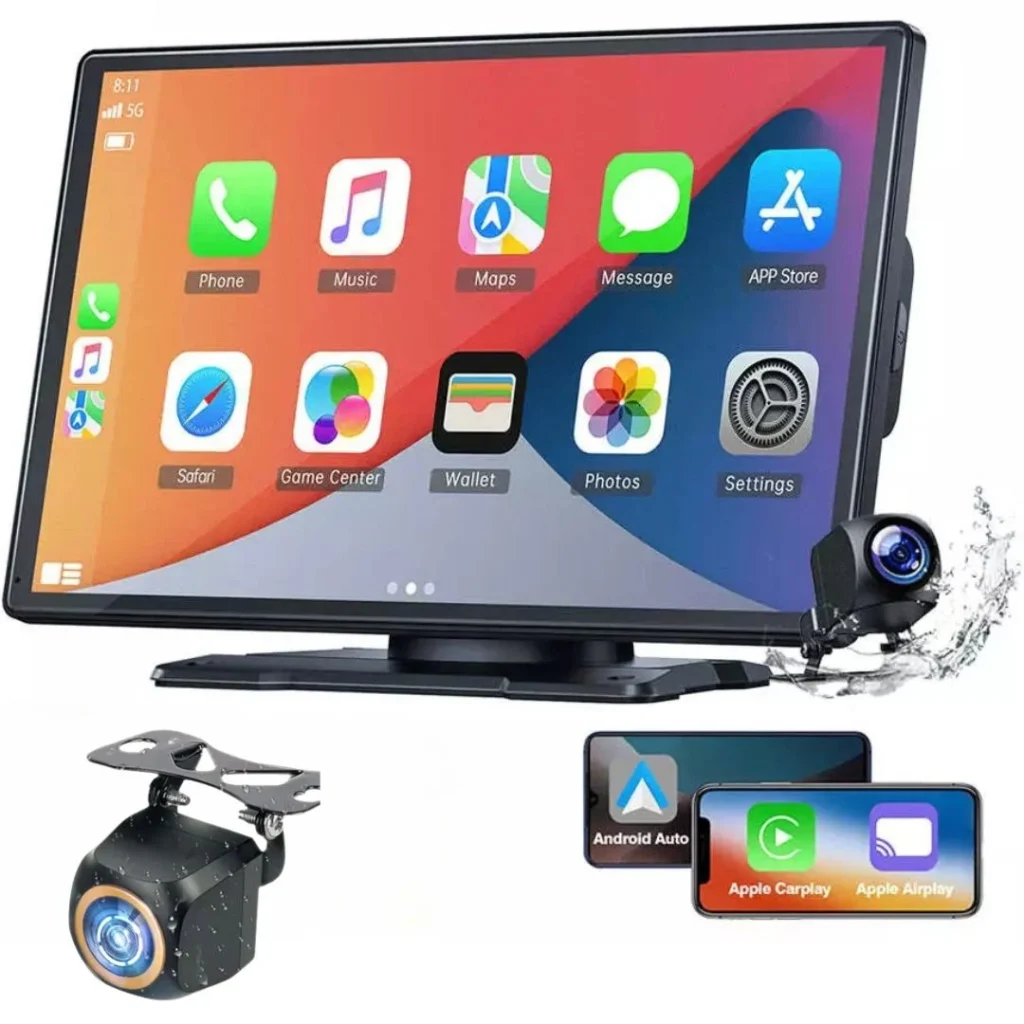 Устройство с 10-инчов тъч екран 4K, оборудвано с камера за задно виждане, SD карта с капацитет 1000 GB, Wi-Fi връзка и пълен набор от предварително инсталирани приложения за GPS навигация, контрол на превозното средство, възпроизвеждане на музика и филми, онлайн телевизия, социални мрежи, съобщения и обаждания.