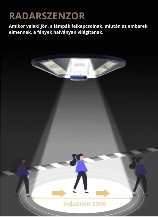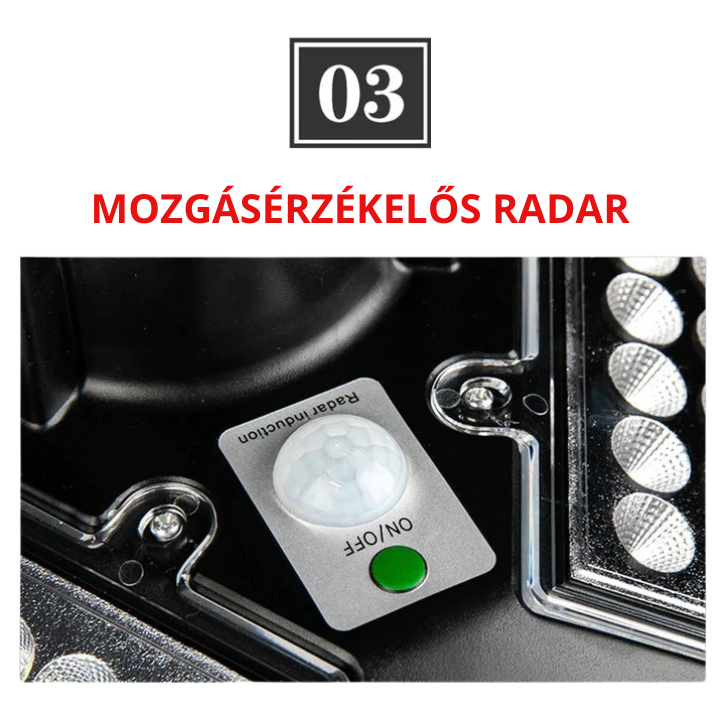 Fény- és mozgásérzékelő: a lámpa automatikusan bekapcsol, ha sötétséget vagy elhaladó személyt érzékel.